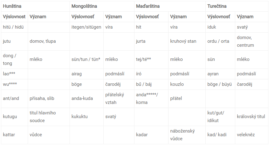 Učiraltu, Péter Polony, Otto Maenchen-Helfen ve svých pracích uvádějí, že čínské kroniky zachovaly mnoho hunských slov. Tyto slova jsou přítomné v tureckém, mongolském a maďarském jazyce. Následující tabulky poukazují na spojení mezi hunskými slovy a slovy mongolštiny, turečtiny a maďarštiny.