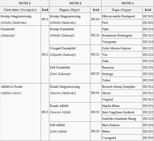 Podle NUTS:HU se Maďarsko dělí ve třech stupních na statistické regiony. První stupeň zemi dělí na tři tzv. části státu (Országrész). Ve druhém stupni na sedm regionů (Régió) a ve třetím na devatenáct žup a hlavní město (megyék és a főváros).