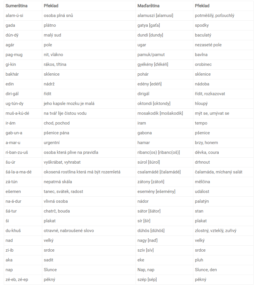 Podívejme se nyní na několik příkladů na jazykovou podobnost sumerštiny a maďarštiny od sumerologa Rudolfa Dudása.