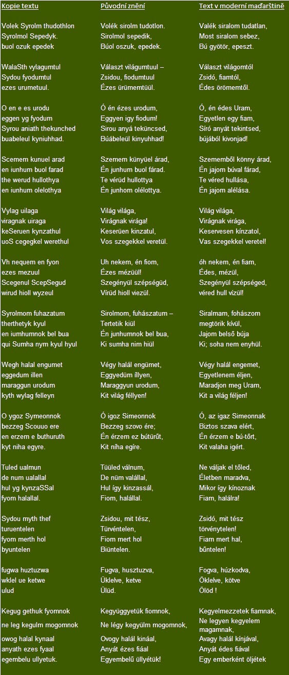 Látjátuk feleim szümtükhel, mik vogymuk: isa, por ës homou vogymuk. Mënyi milosztben terümtevé elevé miü isëmüköt Ádámot, ës odutta volá neki paradicsumot házoá. Ës mënd paradicsumben valou gyimilcsëktül mondá neki élnië. Hëon tilutoá űt igy fá gyimilcsétűl. Gye mondoá neki, mérët nüm ënëik: isa, ki napon ëmdöl az gyimilcstűl, halálnak haláláal holsz. Hadlavá holtát terömtevé Istentűl, gye feledevé. Engedé ürdüng intetüinek, ës ëvék az tilvot gyimilcstűl. Ës az gyimilcsben ha-lálut evék. Ës az gyimilcsnek úl keseröü vala-vizë, hugy turkukat migé szakasztja valá. Nüm hëon mogánek, gye mënd ű fajánek halálut ëvék. Haraguvék Isten ës vetevé űt ez munkás világ belé: ës lëün halálnek ës pukulnek fëszë, ës mënd ű nemének. Kik ozuk? Miü vogymuk. Hugy ës tiü látjátuk szümtükhel: isa, ës nüm igy embër múlhatja ez vermöt, isa mënd azhuz járou vogymuk. Vimádjuk Uromk Isten këgyilmét ez lélekért, hugy jorgasson ű neki, ës kegyigygyën, ës bulcsássa mënd ű bűnét!